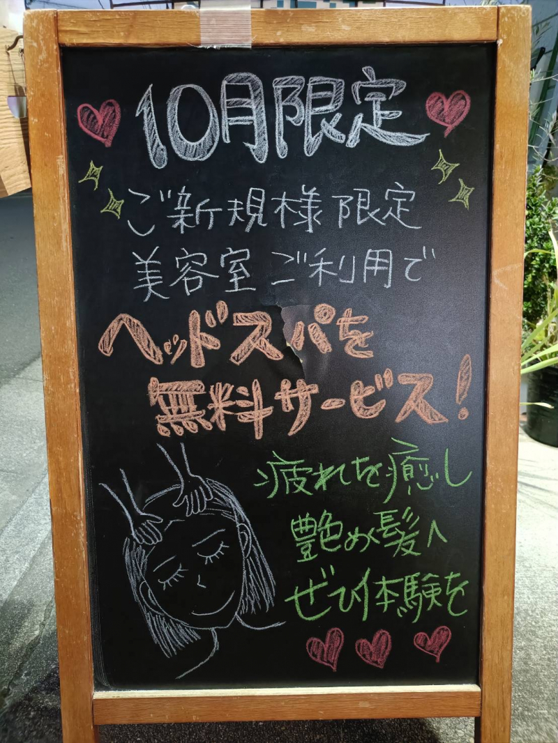 2025.10.10 10月限定!! ご新規様に限り 美容室のご利用でヘッドスパ(¥3.300)をサービス!! ヘッドスパには血行促進・リフトアップ・小顔効果・眼精疲労・肩こりの軽減・自律神経のバランスを整える・頭皮の汚れ・皮脂除去などのたくさんの効果があります もちろんリラックス効果が高いので終わったあとのスッキリ感が絶大! 今月のみの限定なので急いでご予約を!! LEASON 一覧へ戻る